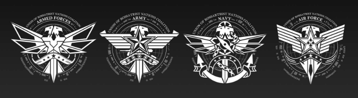 Справа налево: эмблемы Вооруженных сил URNC, армии URNC, ВМС URNC и ВВС URNC
